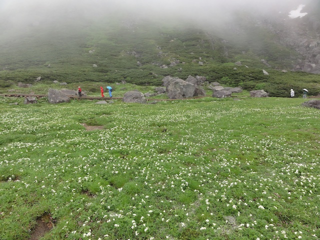 _ ということで、乗鞍岳の主峰、標高 3026m の剣ヶ峰まで。数字の上では 3000m 級の山なんだけど、畳平から山頂までの標高差は 300m、たったの1時間半で登れちゃう楽ちんな山。はじめは青空も見えてたんだけど、どんどん雲が出てきて、 山頂に辿りつくころには空はまったく見えず。視界はそれほどよくないし、何より行程がラクすぎていまいち感動に欠ける。そして下山をはじめてすぐに雨が降りはじめ、ほどなく土砂降りに。お手軽だからといって雨具も持たずに手ぶらで山に登るようなアホがたくさんいたけど(サンダル履きなんてアホもいた)、彼らは大変な目にあったようですね(他人事)。休日の昼間で人がたくさんいて、わざと登山道からはずれるかよほど濃い霧になるか雷に打たれでもしないかぎり遭難のしようがないだろうから、体の芯が冷えきるまで反省すればいいと思います。