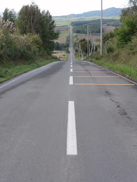 _ 上富良野のジェットコースターの道。ふつーは地形に合わせててきとーにカーブした道を作るもんだが、北海道の人は道はまっすぐでなければならないとかいう強迫観念でもあるんだろうか。