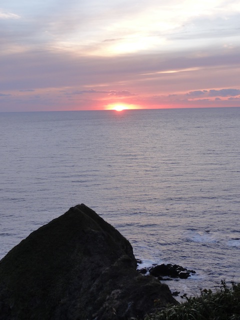 _ で、襟裳岬に到着。ちょうど夕暮れ時。水平線の向こうに陽が落ちるのをぼけーっと眺めて本日はおしまい。岬の先端近くの駐車場でそのまま車中泊モードに移行。